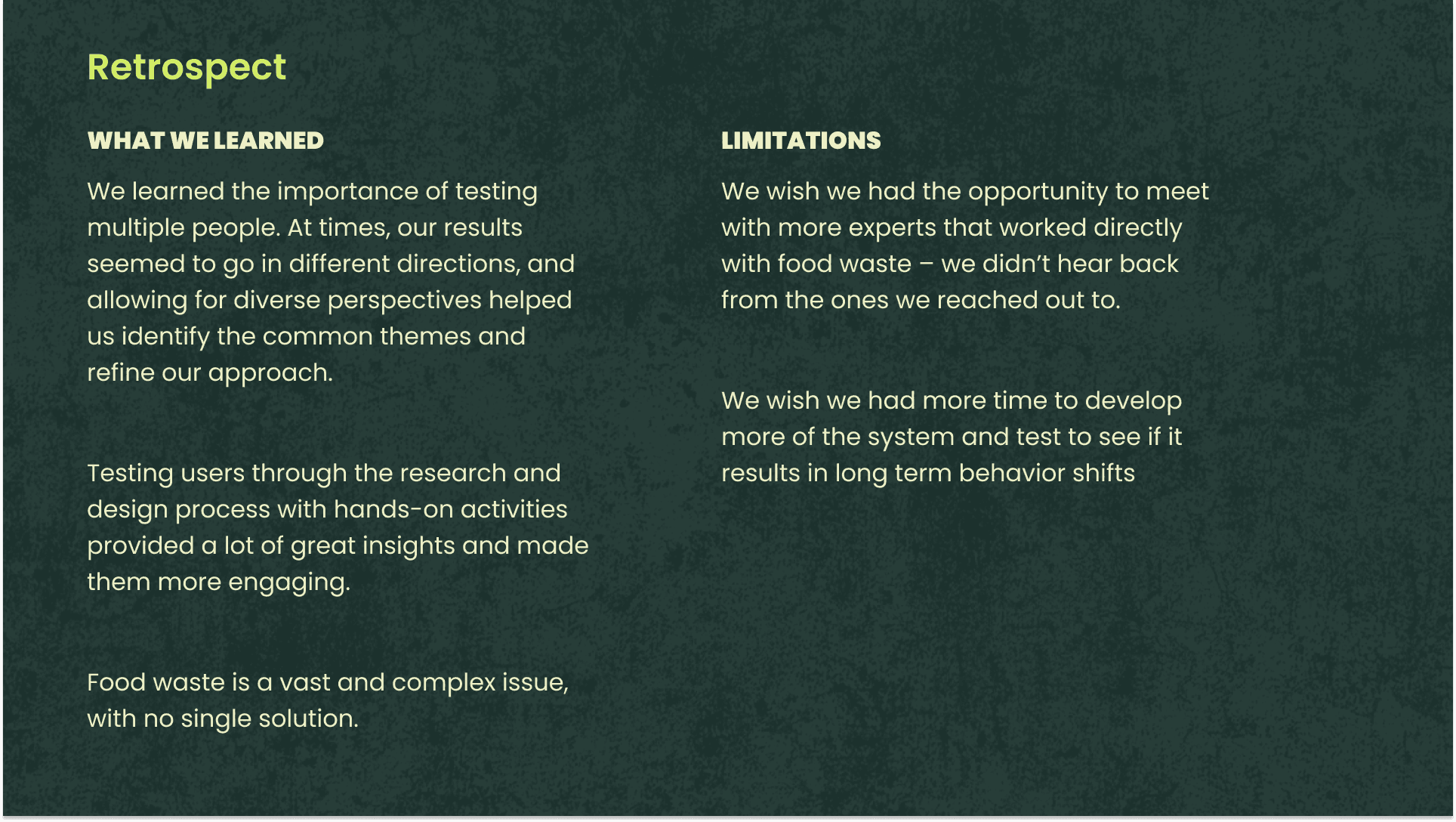 This project reinforced the importance of deeply understanding a client’s real-world challenges. Without research and empathy, it’s impossible to design solutions that truly address their needs.