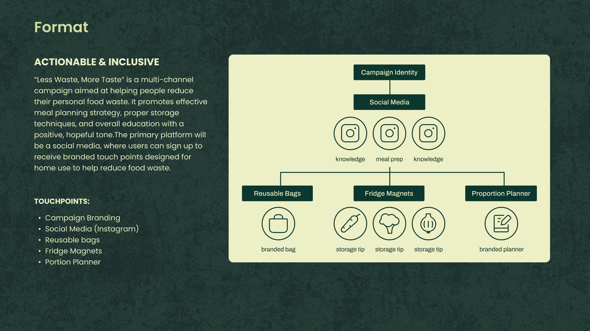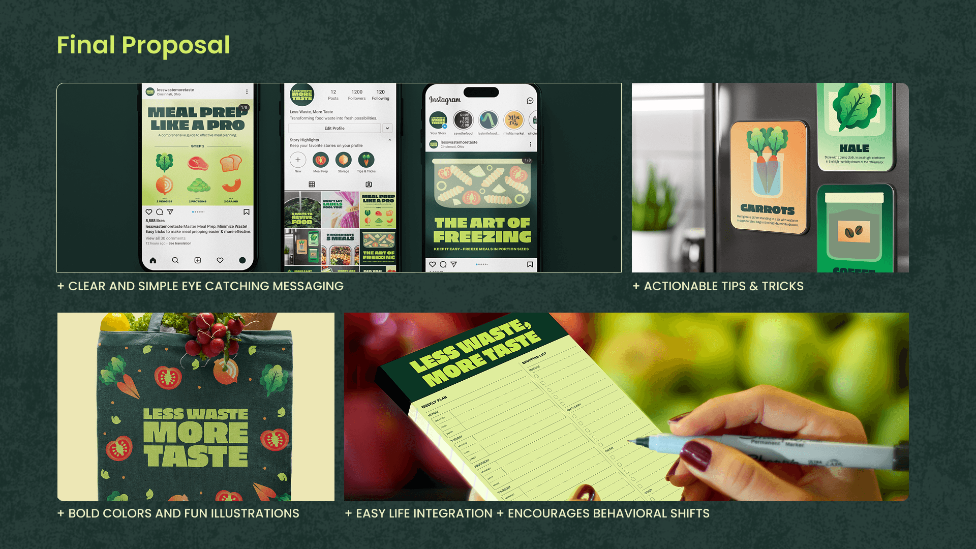 “Less waste, more taste” is a design campaign that raises awareness about food waste and prevention for the average household, providing them with actionable tips and tools to decrease waste.